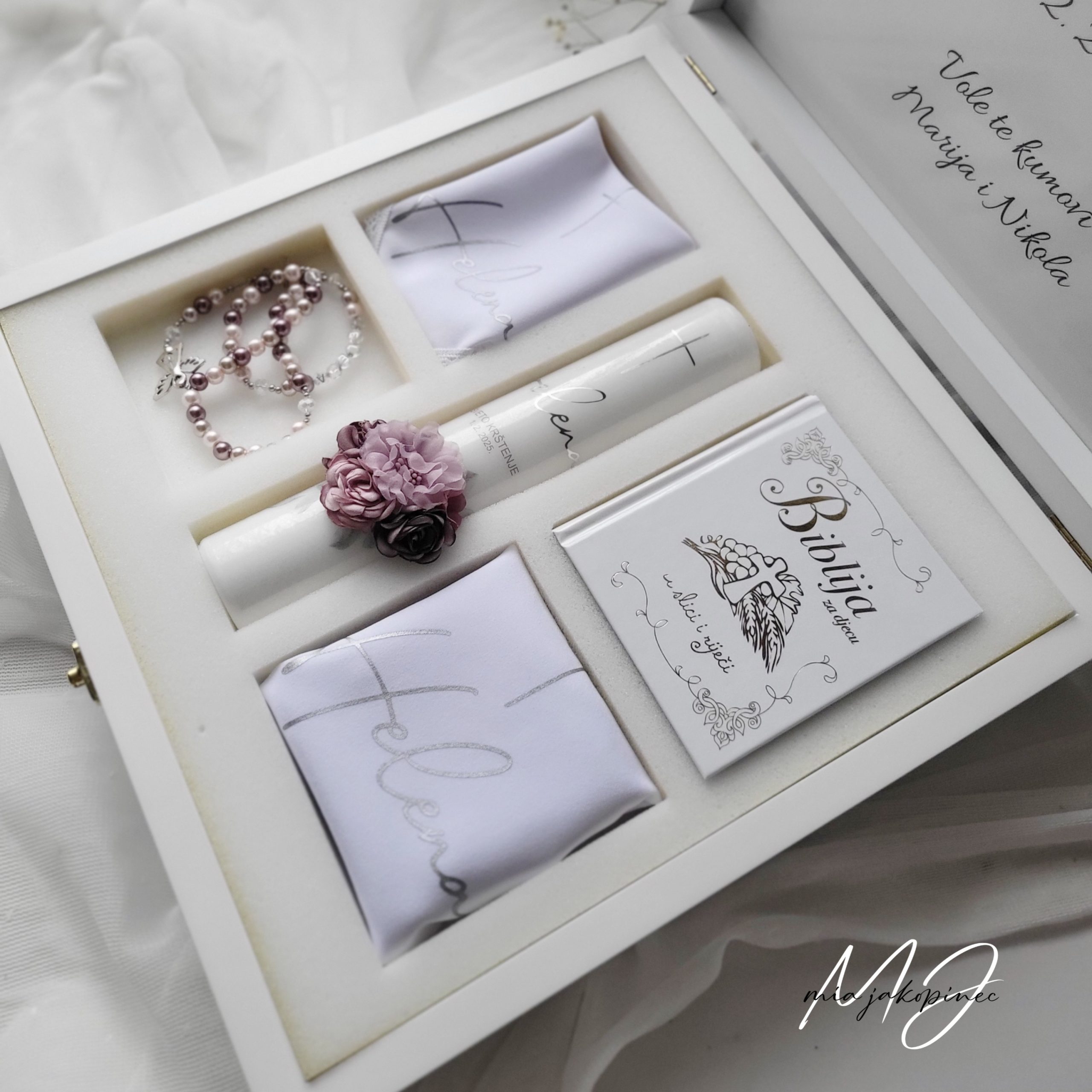 Sadrzaj: svijeca, kosuljica, maramica, krunica, mala ilustrirana biblija (ona je uvijek sa zlatnim slovima)